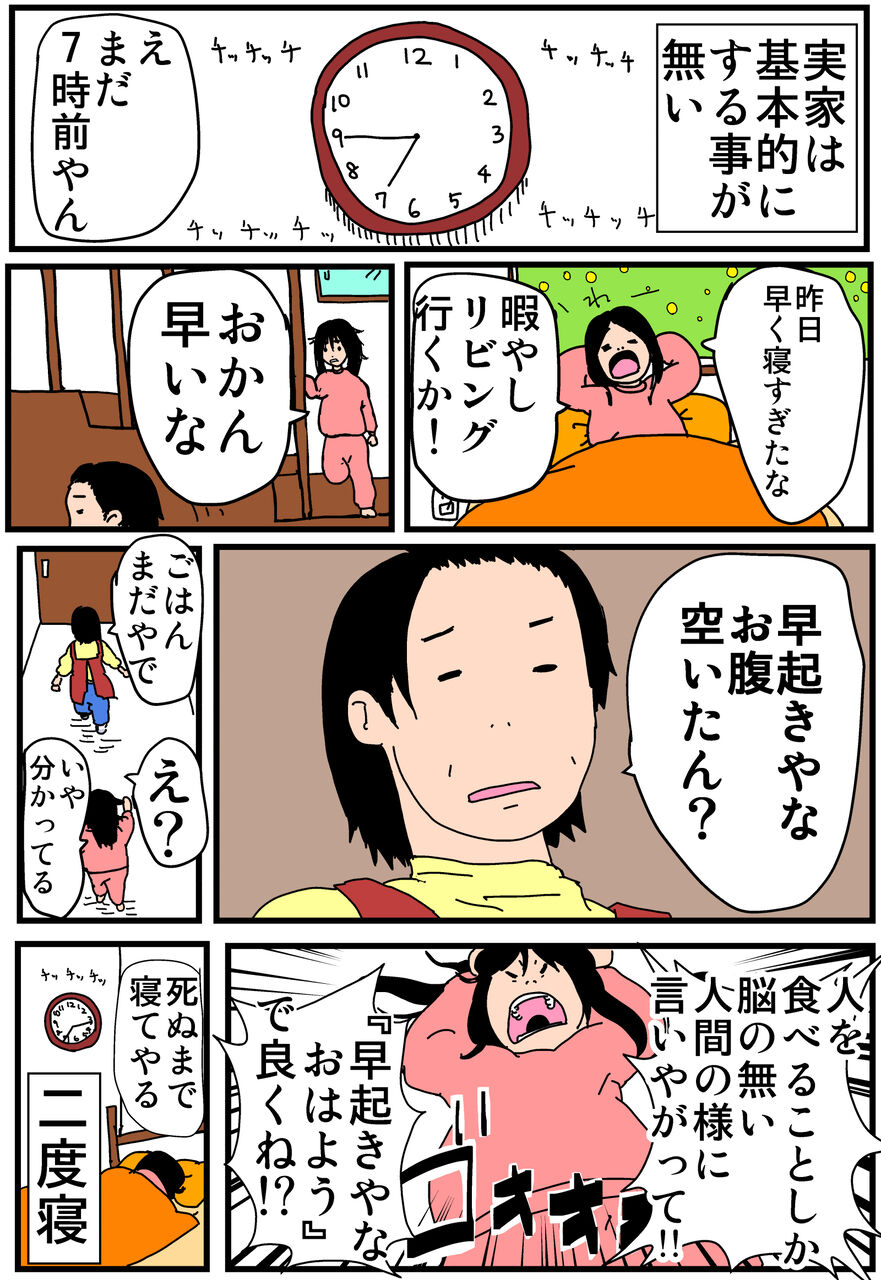 2021年10月13日 実家での朝 実家での朝母とのやり取りトイレ行っていざ二度寝してやる…!!!とうとうとし出したら・・・実家へ帰るとやたらと食べさせられるというのはあるあるではないでしょうか?リビングにいると「お腹すいたん?」と母親は聞いてきます。まあ出されたら何でも食べてましたが!! タグ :#コミックエッセイ#日常漫画#実家#母親#朝ごはん#二度寝#母娘 「日常漫画」カテゴリの最新記事 < 前の記事次の記事 > コメント コメントフォーム 名前 コメント 記事の評価 リセット リセット 顔 星 情報を記憶 コメントを投稿する