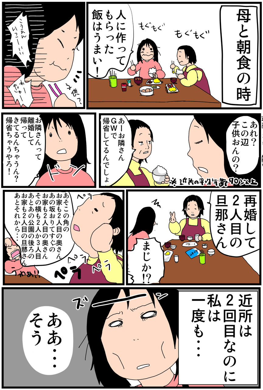 2021年10月14日 奥様は情報通 実家へ帰った際母親との朝食の時…おかんは何でも知ってんな…近所のうわさ話なのかなぜそんな事も知ってるの!!!!!ってことまで何でも知っているうちの母親。ご近所の結婚が2回目どころか3回目とか(;^ω^)逆に近所からも「あの家のあの子はあの学校へ行ってあそこで働いて○○に住んでて」とか聞こえてくる…おかん…言ってるやろ。自分の家の情報を通貨に情報仕入れてるやろ!!!!!! タグ :#母娘#日常漫画#実家#コミックエッセイ#噂話#うわさ#母親#漫画#結婚#離婚 「日常漫画」カテゴリの最新記事 < 前の記事次の記事 > コメント コメントフォーム 名前 コメント 記事の評価 リセット リセット 顔 星 情報を記憶 コメントを投稿する