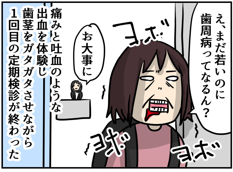 2022年07月18日 【虫歯・歯周病】7年ぶりに歯医者に行った話【親知らず抜歯】 ⑩ 前回の記事はこちら 口の中をスケーリングしてもらった後、うがいしたら吐血状態でビビりました。「何これ!?」って動揺しました。。。。7年も放置すると1回じゃ取れないらしく、何回か行かないといけないみたいです。麻酔しますか?って何回も聞かれましたが、虫歯のような神経触る痛みではなかったので無しで乗り切りました。慣れてきた今はありませんが、スケーリングをしてもらった後やたらと歯茎がスース―してかゆいというか、ガクガクしました。ショックでよぼよぼになって帰りました。続きはこちら ■□■□■□■□■□■□■□■□■□■□ブログのまんがをまとめました!一気読みはこちら!無料です!にほんブログ村登録してみました! タグ :#虫歯#歯医者#歯周病#親知らず#スケーリング 「日常漫画」カテゴリの最新記事 < 前の記事次の記事 > コメント コメントフォーム 名前 コメント 記事の評価 リセット リセット 顔 星 情報を記憶 コメントを投稿する