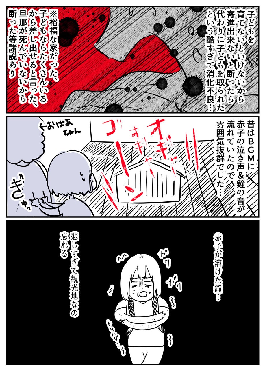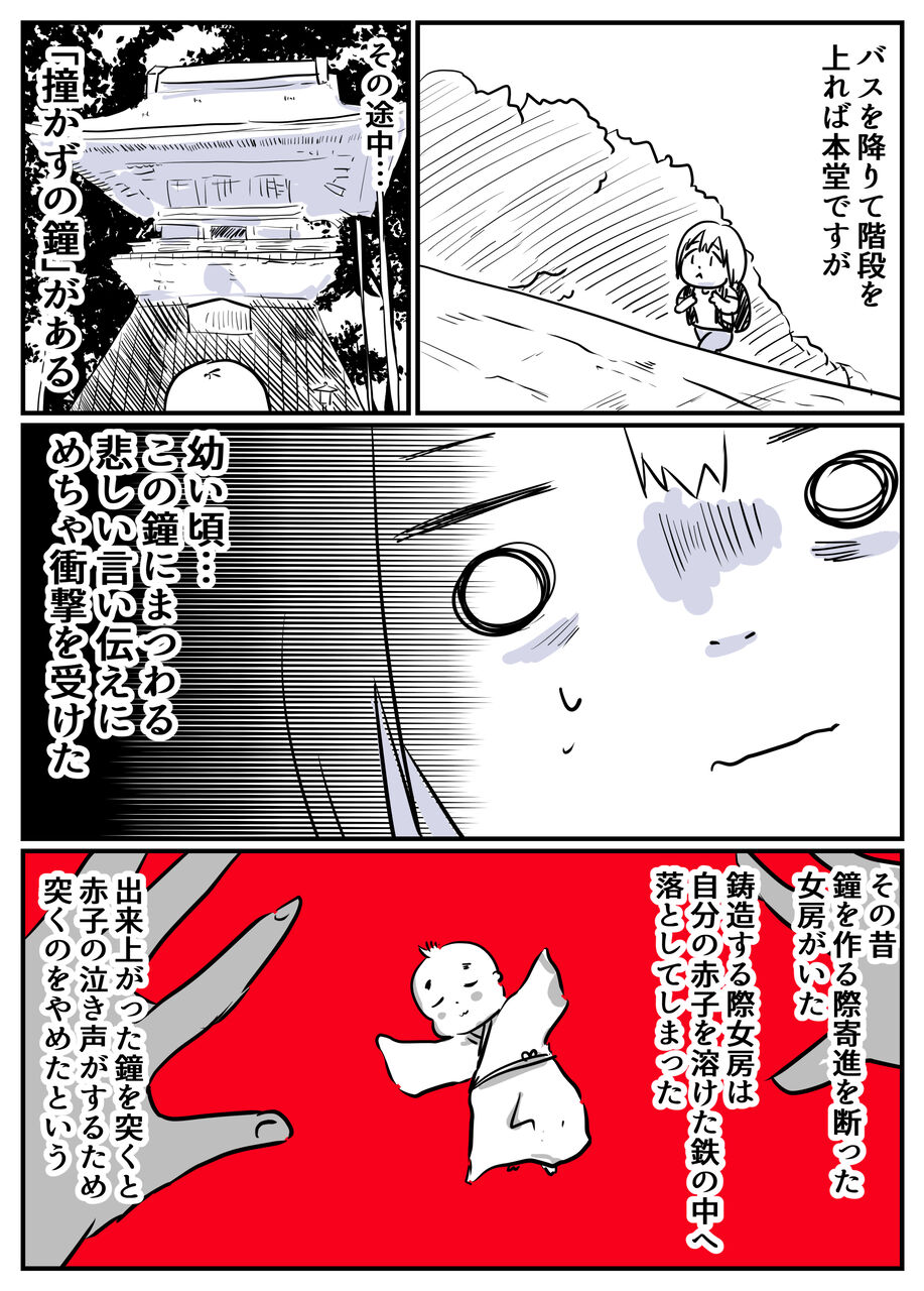 幼い頃トラウマになった観光名所。鋳造する際に赤ちゃんを溶けた鉄の中に落としてしまい撞くと赤ちゃんの泣き声がする撞かずの鐘を観光しました。