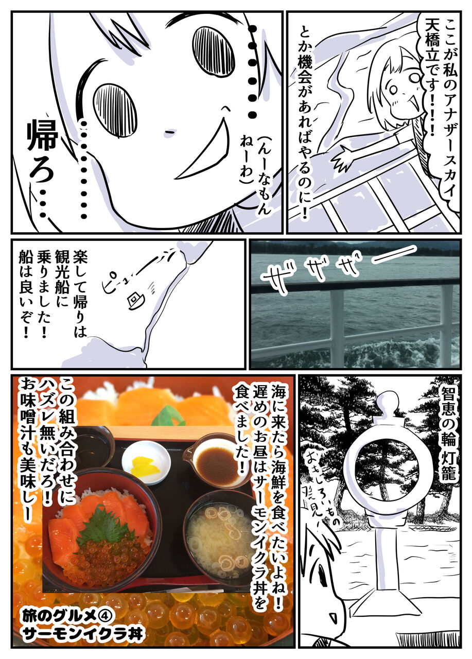 2023年08月09日 【旅行】一人旅で天橋立に行ったら最高だった話 ⑤【日本三景】 前回の記事はこちら パノラマ展望台は成相寺まで行く観光客は少ないので、風情あってゆっくり天橋立も見れるので穴場です!疲れ切った現代人はエネルギーチャージに行くべし!また更新します!■□■□■□■□■□■□■□■□■□■□ブログのまんがをまとめました!一気読みはこちら!無料です!にほんブログ村登録してみました! タグ :#天橋立 「一人旅」カテゴリの最新記事 < 前の記事次の記事 > コメント コメントフォーム 名前 コメント 記事の評価 リセット リセット 顔 星 情報を記憶 コメントを投稿する