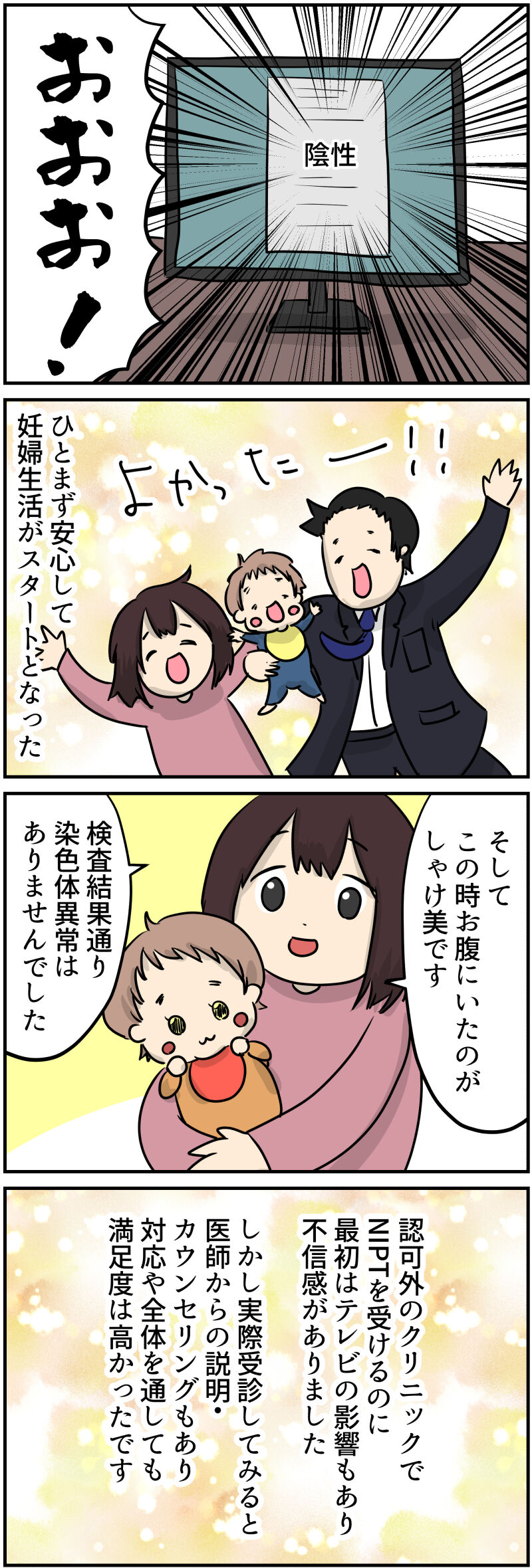 血液検査だけで調べられるなんてと半信半疑な部分もありましたが、おかげで安心して妊婦生活を送れました。