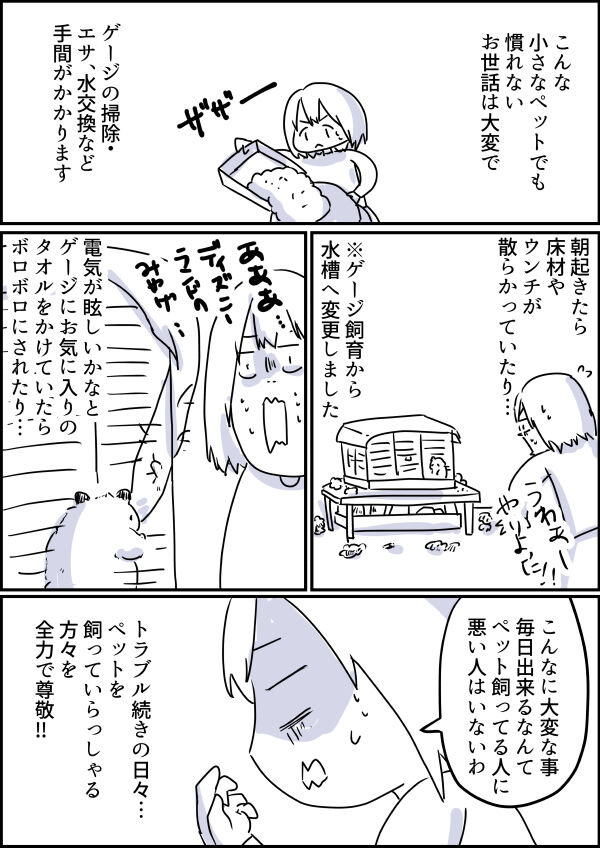 2024年03月09日 #1 ハムスター飼ってた時の話「あまりの可愛さに大変な事全部忘れる」 お久しぶりです。昔の日記を読んでいたら、当時飼っていた最愛のペットのキンクマハムスターのナッツちゃんの記事を見つけました。思い出すと漫画にしたくなり、少し長くなりますが描いてみようと思います。漫画の中にも描きましたが、ペットを飼うのがこのナッツちゃんが初めてでした。慣れていない事や初めての事も多く、お世話をする、一緒に暮らすという事が最初はとても大変でした。慣れてからは可愛いしかありません!続きはこちら おすすめ記事 ■□■□■□■□■□■□■□■□■□■□ブログのまんがをまとめました!一気読みはこちら!無料です! にほんブログ村登録してみました! 「ハムスター飼ってた時の話」カテゴリの最新記事 < 前の記事次の記事 > コメント コメントフォーム 名前 コメント 記事の評価 リセット リセット 顔 星 情報を記憶 コメントを投稿する