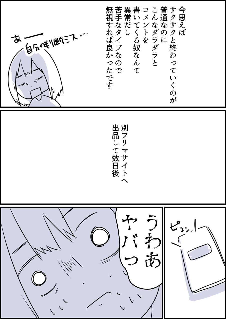 2025年05月08日 フリマサイトでクレーマーにiPad売ってしまった話 2 前回のお話 ストーカーやん一瞬思いましたが、私も早く売ってしまいたかったのとイラストを描く人に譲りたかったのでWinWinだと思ったんですがね…続き ★おすすめ記事 ■□■□■□■□■□■□■□■□■□■□ブログのまんがをまとめました!一気読みはこちら!無料です!にほんブログ村登録してみました! 「日常漫画」カテゴリの最新記事 < 前の記事次の記事 > コメント コメントフォーム 名前 コメント 記事の評価 リセット リセット 顔 星 情報を記憶 コメントを投稿する